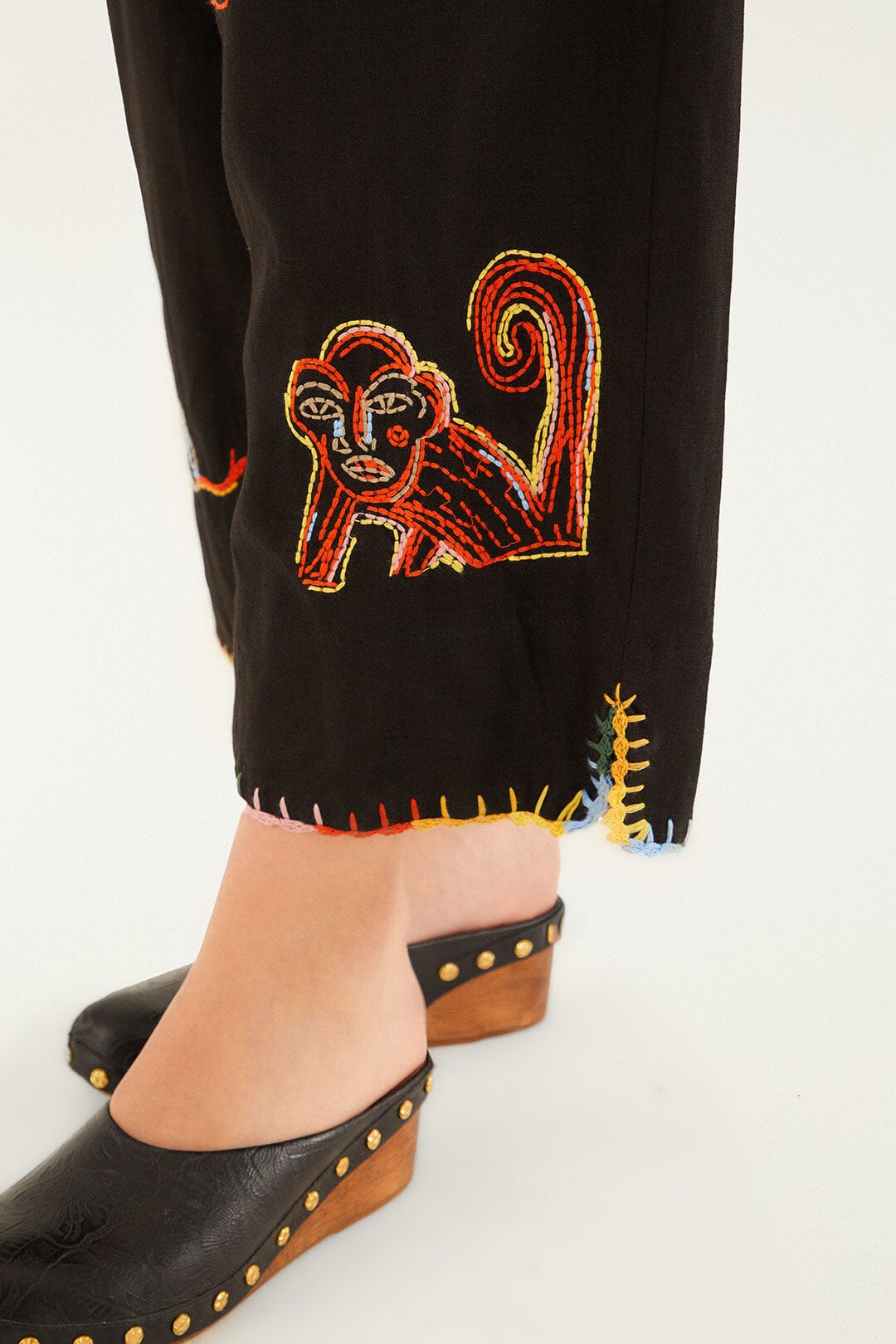 The Ana Leovy Farm Rio maxi jumpsuit embraces a relaxed silhouette with a playful collar neckline and elbow-length sleeves. Crafted from eco-friendly Lenzing Ecovero viscose and breathable Euroflax linen, it showcases vibrant, whimsical embroidered figures in bright hues against a deep black canvas. Delicate multicolor stitching along the edges adds a handcrafted charm, making this jumpsuit a joyful blend of artful design and comfortable elegance.
