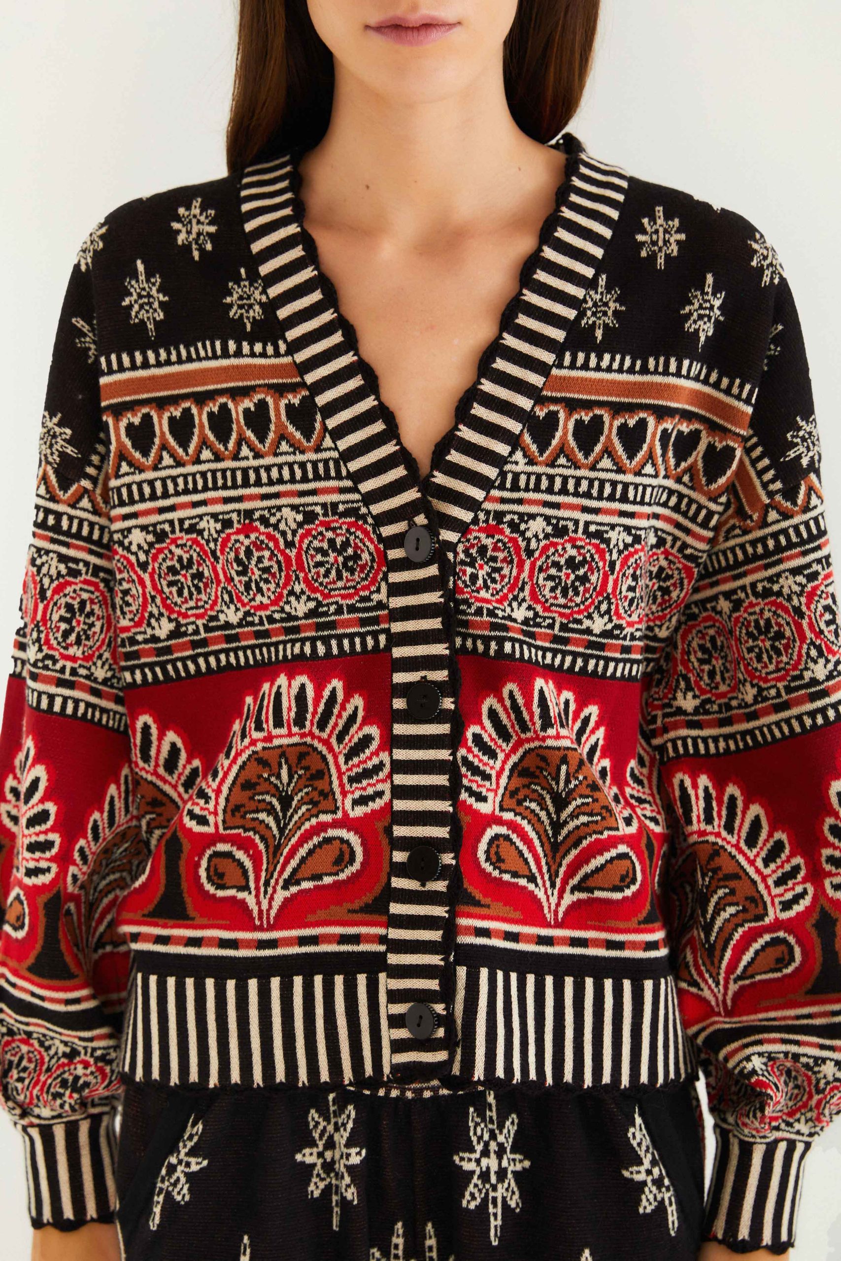 The Black Ainika Love Coconut Groove Knit Cardigan enchants with its bold, intricate pattern blending hearts, florals, and geometric motifs in warm reds, browns, and neutrals. Its relaxed silhouette, softly puffed sleeves, and striped ribbed trims bring a playful yet cozy charm. The deep V neckline enhances its inviting embrace, making it a vibrant statement piece that wraps you in comforting style and spirited energy, perfect for radiant moments.