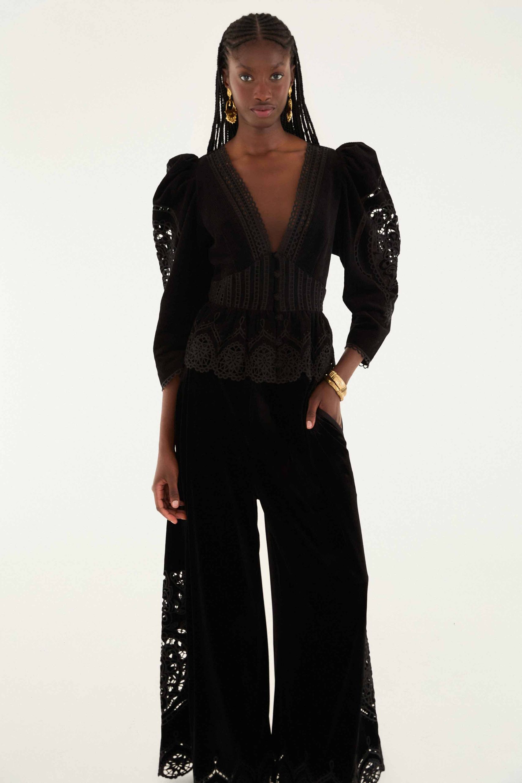 The Black Artichoke Heart Richelieu Pants embody elegance with their flowing wide-leg silhouette in sumptuous black velvet. Delicate Richelieu lace panels trace an artichoke-inspired pattern along the sides and scalloped hem, adding a whisper of intricate craftsmanship and subtle allure. These pants drape softly with movement, creating a harmonious blend of texture and finesse that invites a cozy yet sophisticated expression of style.