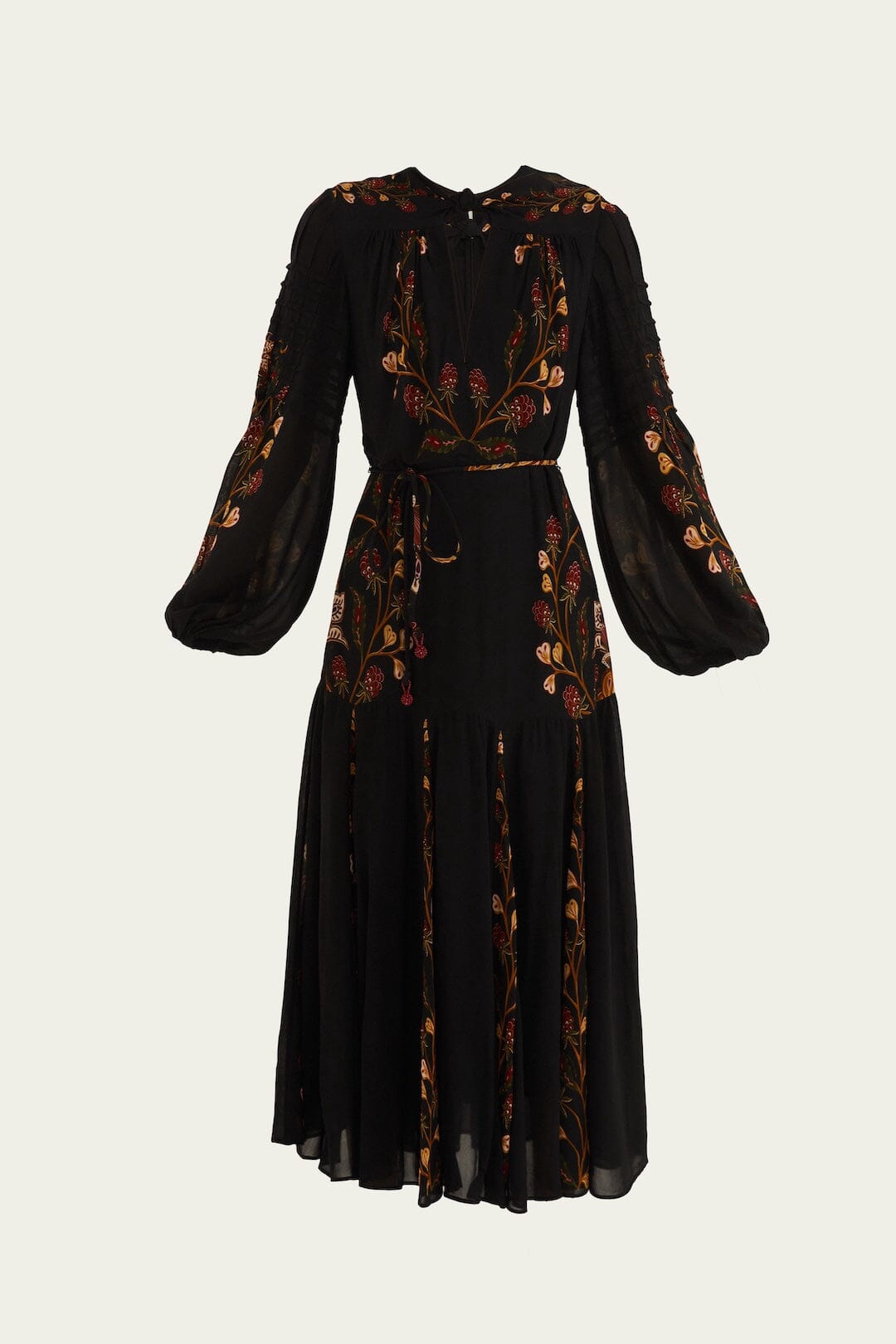 The Black Berry Garden Long Sleeve Pleated Maxi Dress envelops you in a graceful silhouette, with its flowing pleated skirt and delicate V neckline inviting quiet confidence. Embellished with enchanting floral motifs in warm reds and earthy greens, this black dress tells a story of nature’s charm. Sheer billowy sleeves add a whispered elegance, capturing both softness and subtle drama for every gentle breeze.