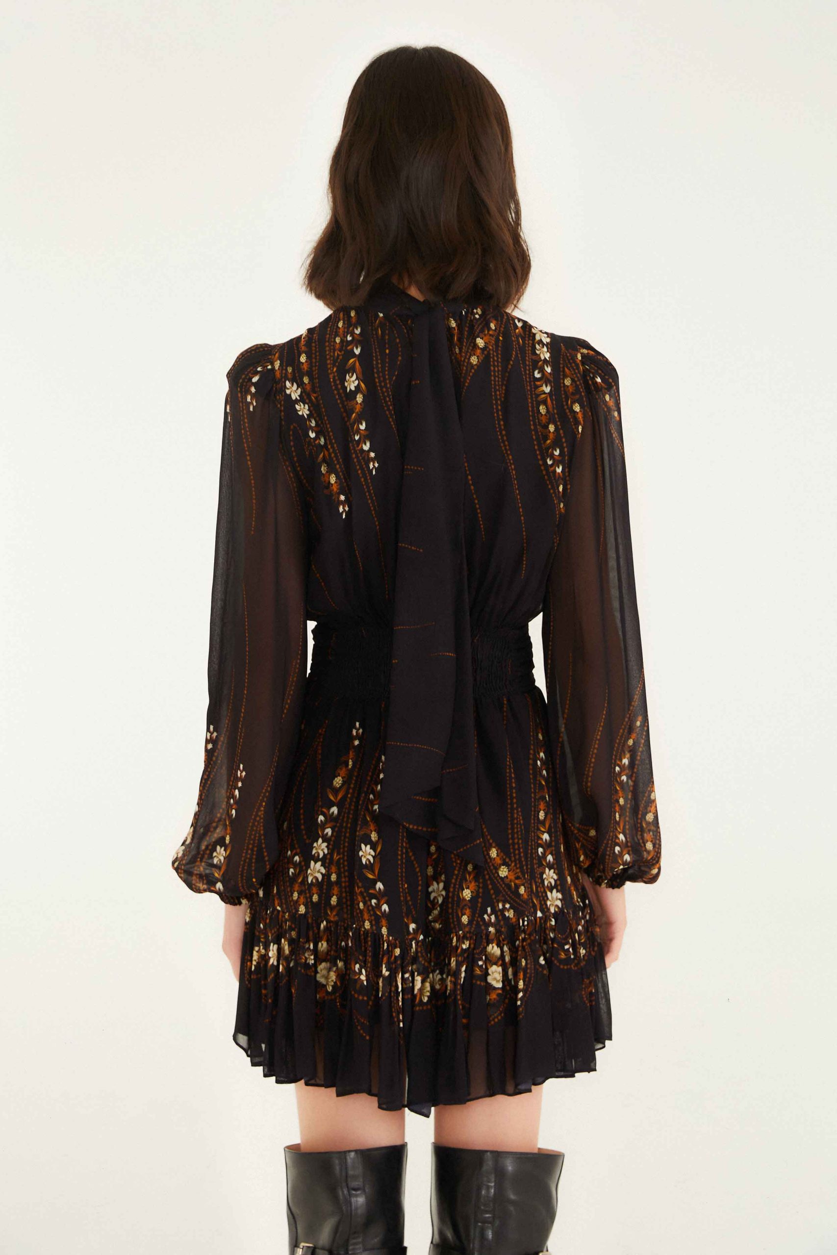 Embrace an enchanting garden vibe with this Black Garden 3d Rose Long Sleeve Ruffled Mini Dress, where sheer, billowing sleeves soften the silhouette. The high neckline, adorned with a sculpted rose detail, exudes a romantic charm that ties the look together with the matching belt cinching the waist. Delicate floral patterns cascade over the flowing skirt, finishing with playful ruffles that dance with movement, creating an irresistible allure.