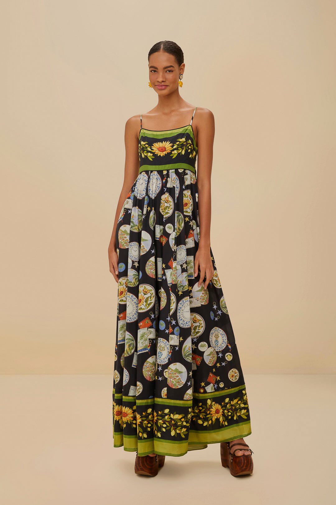 Step into vibrant elegance with the Black Trip Souvenir Maxi Dress by FARM Rio. This enchanting piece showcases a playful mix of colorful, eclectic patterns against a deep black canvas. The gathered silhouette flows gracefully, while the square neckline adds a touch of classic charm. Sunflower motifs and whimsical details evoke a sense of joyful wanderlust, making it a standout piece for any occasion. Embrace the artistry and warmth of this captivating dress.