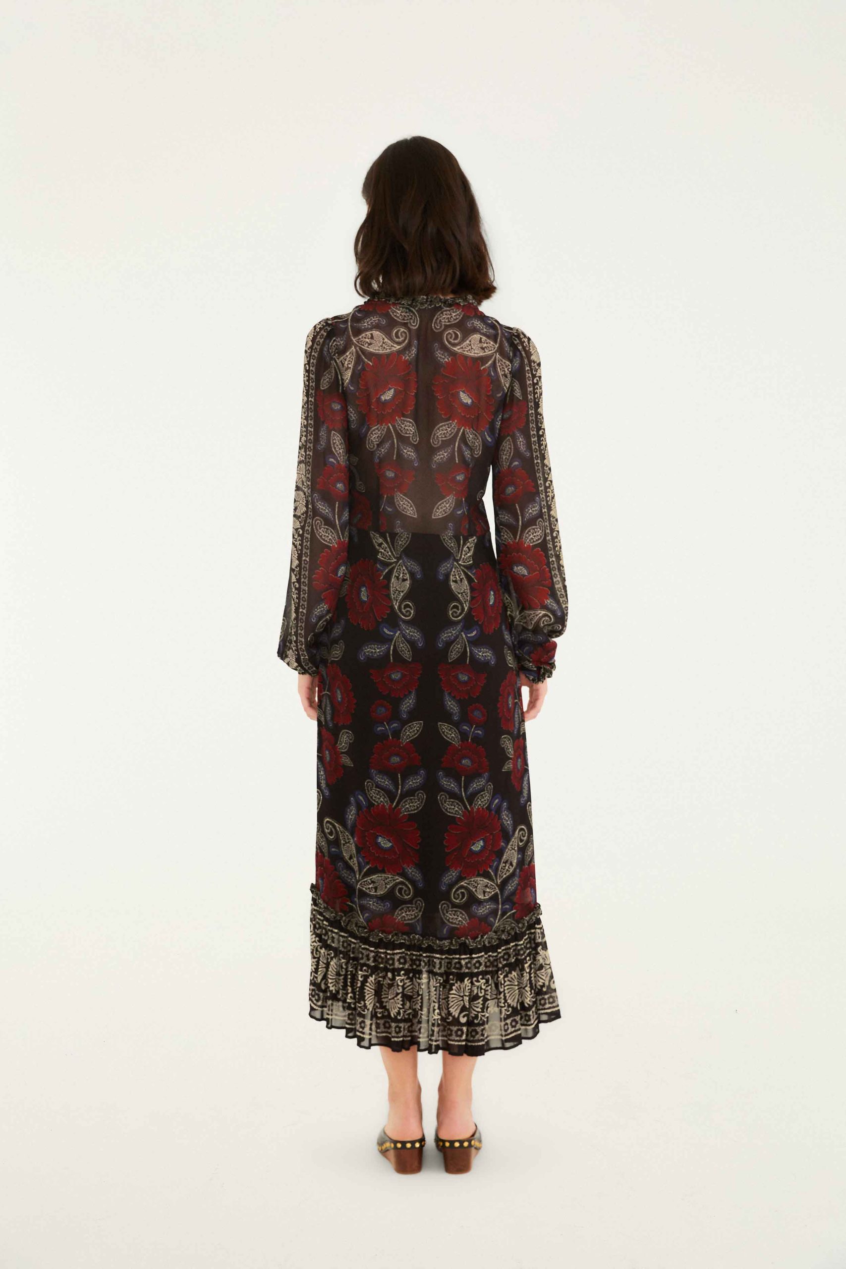 The Black Valentina Ruffled Long Sleeve Midi Dress enchants with its flowing silhouette and gentle ruffle trims that frame a flattering V neckline. Its sheer long sleeves add an airy, delicate touch, while the rich black fabric blooms with bold red and soft blue floral patterns intertwined with elegant paisley motifs. A playful frilled hem anchors the look, inviting warmth and effortless charm into every moment.