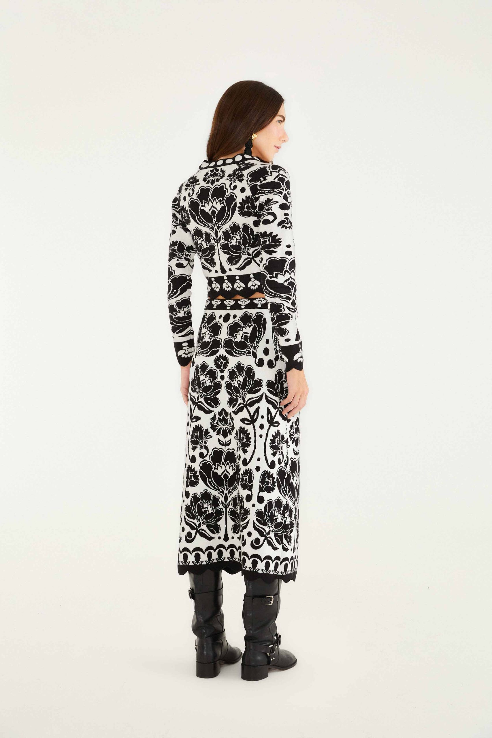 Step into artful elegance with the Black & White Floral Arabesque Knit Skirt by FARM Rio. This captivating piece features a bold monochrome palette adorned with intricate floral and arabesque patterns, creating a striking visual harmony. The knit fabric gently hugs the silhouette, while scalloped edges add a playful, handcrafted touch. With front buttons and cozy pockets, this skirt marries comfort with a distinctive, statement-making charm.