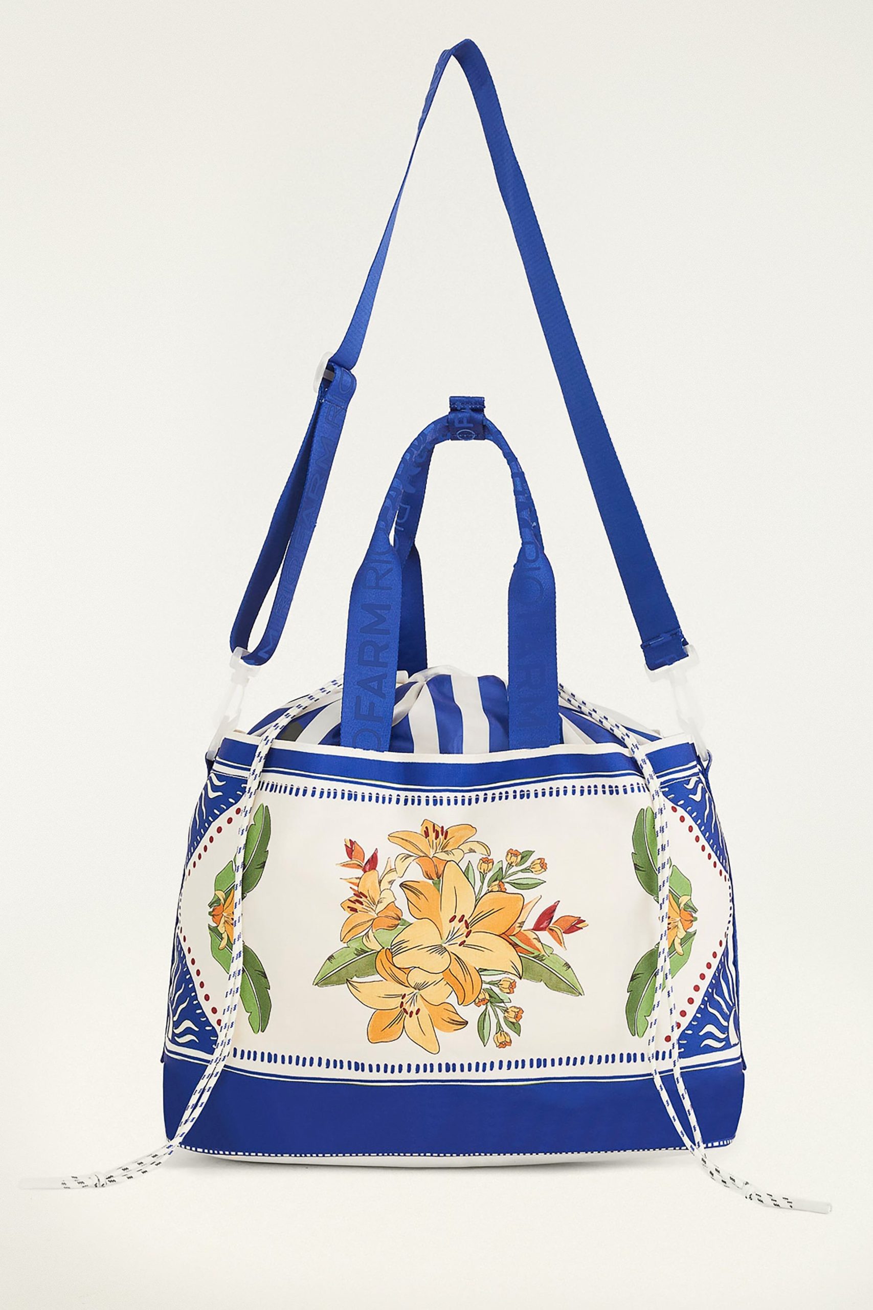 Embrace vibrant energy with the Blue Carioca Tropical Destiny Drawstring Tote Bag from FARM Rio. This lively tote showcases a rich palette of blues adorned with tropical foliage and playful floral patterns, evoking the spirit of Rio’s sun-soaked days. Its relaxed silhouette and soft drawstring closure create an effortlessly casual feel, perfect for beach strolls or city adventures. Lightweight yet spacious, it’s a joyful companion for every moment.