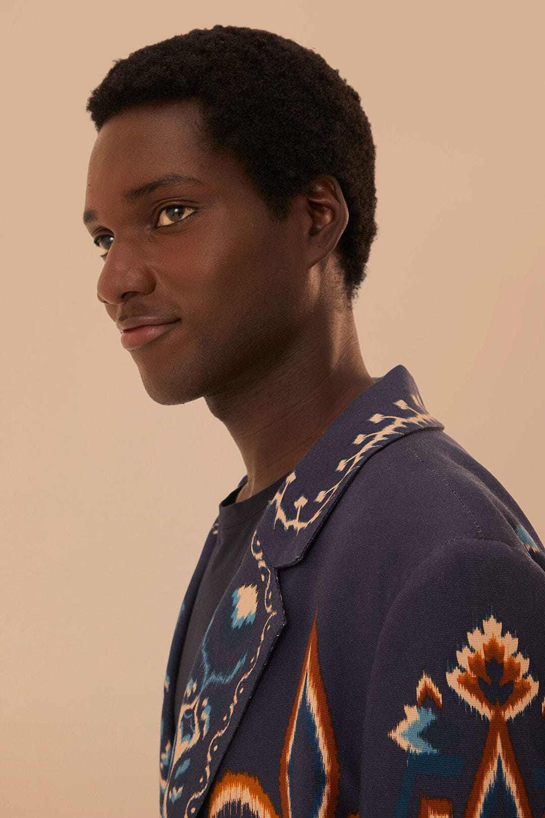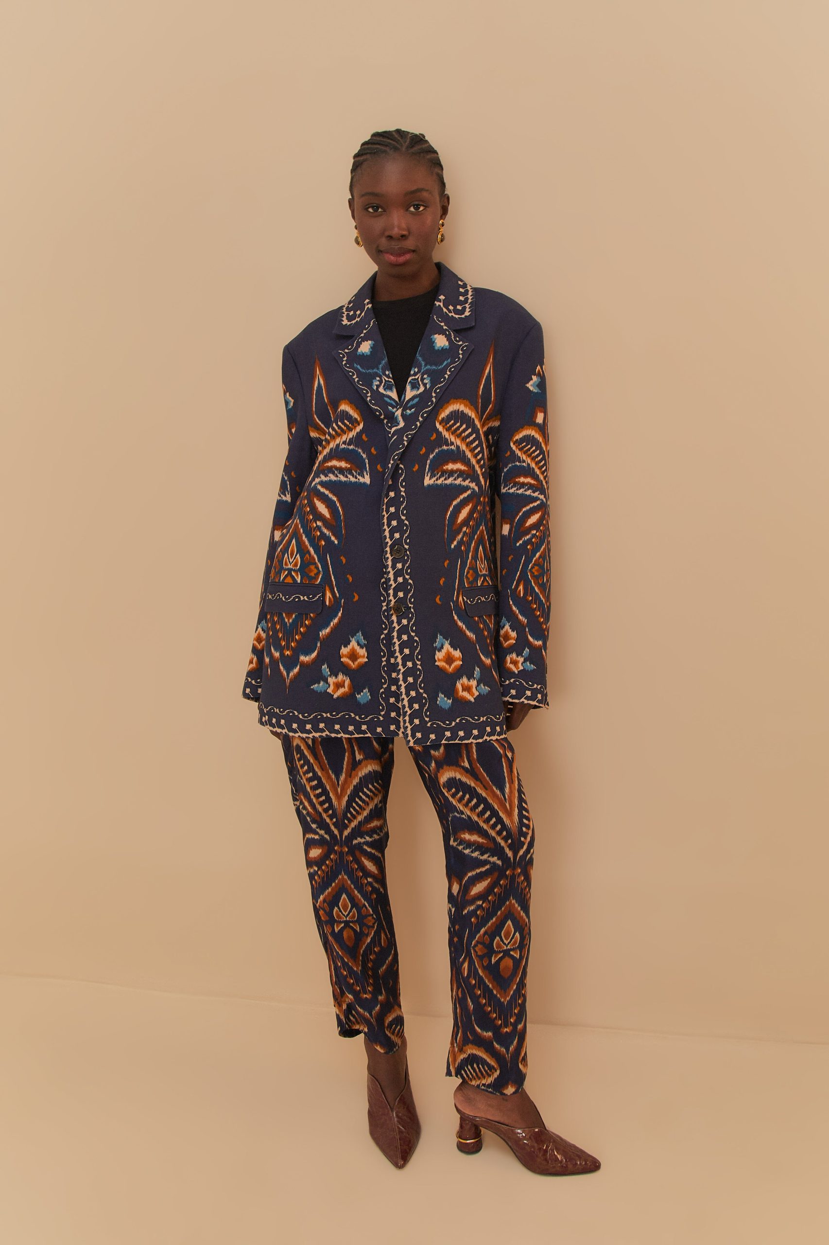 Embrace a touch of tropical sophistication with the Blue Pineapple Ikat Blazer from FARM Rio. Rich in navy hues highlighted by vibrant orange and sky blue patterns, this blazer sports a unique ikat pineapple motif that sets a playful yet refined tone. With a relaxed fit and collar neckline, its silhouette effortlessly transitions from casual gatherings to evening events. This statement piece infuses any wardrobe with the brand’s signature joyful essence and Brazilian flair.