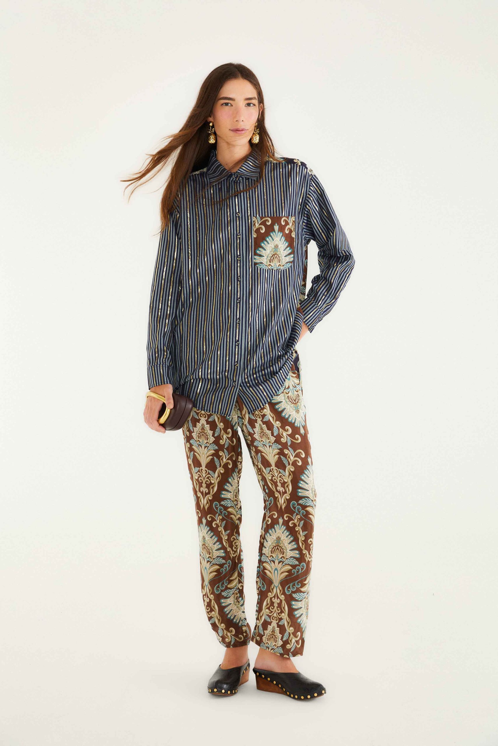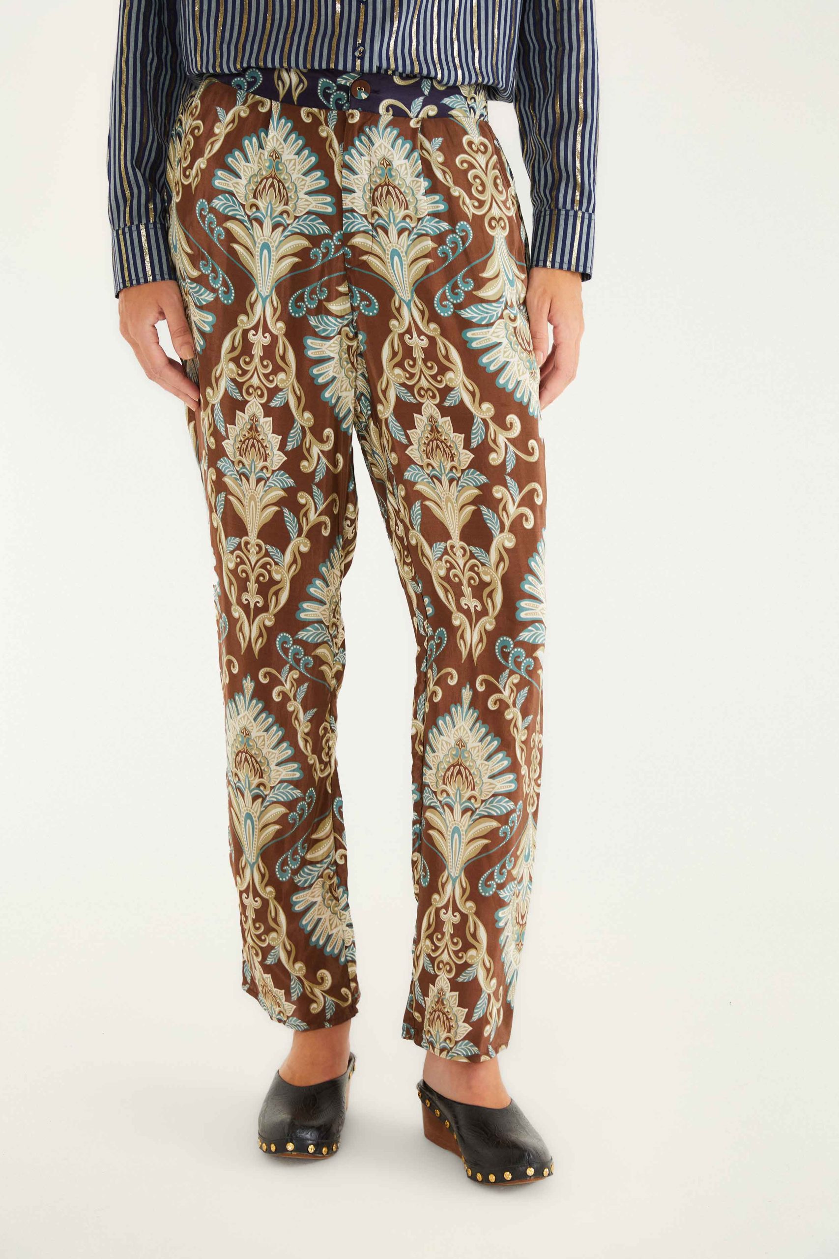 The Brown Wonderful Arabesque Pants showcase an enchanting blend of warm brown tones and delicate blue and cream arabesque patterns that flow gracefully across the fabric. Their straight-leg silhouette invites effortless movement, capturing comfort and charm in every step. Crafted for those who cherish playful sophistication, these pants bring a touch of exotic elegance and relaxed confidence to your day, embodying the spirited soul of FARM Rio’s design.