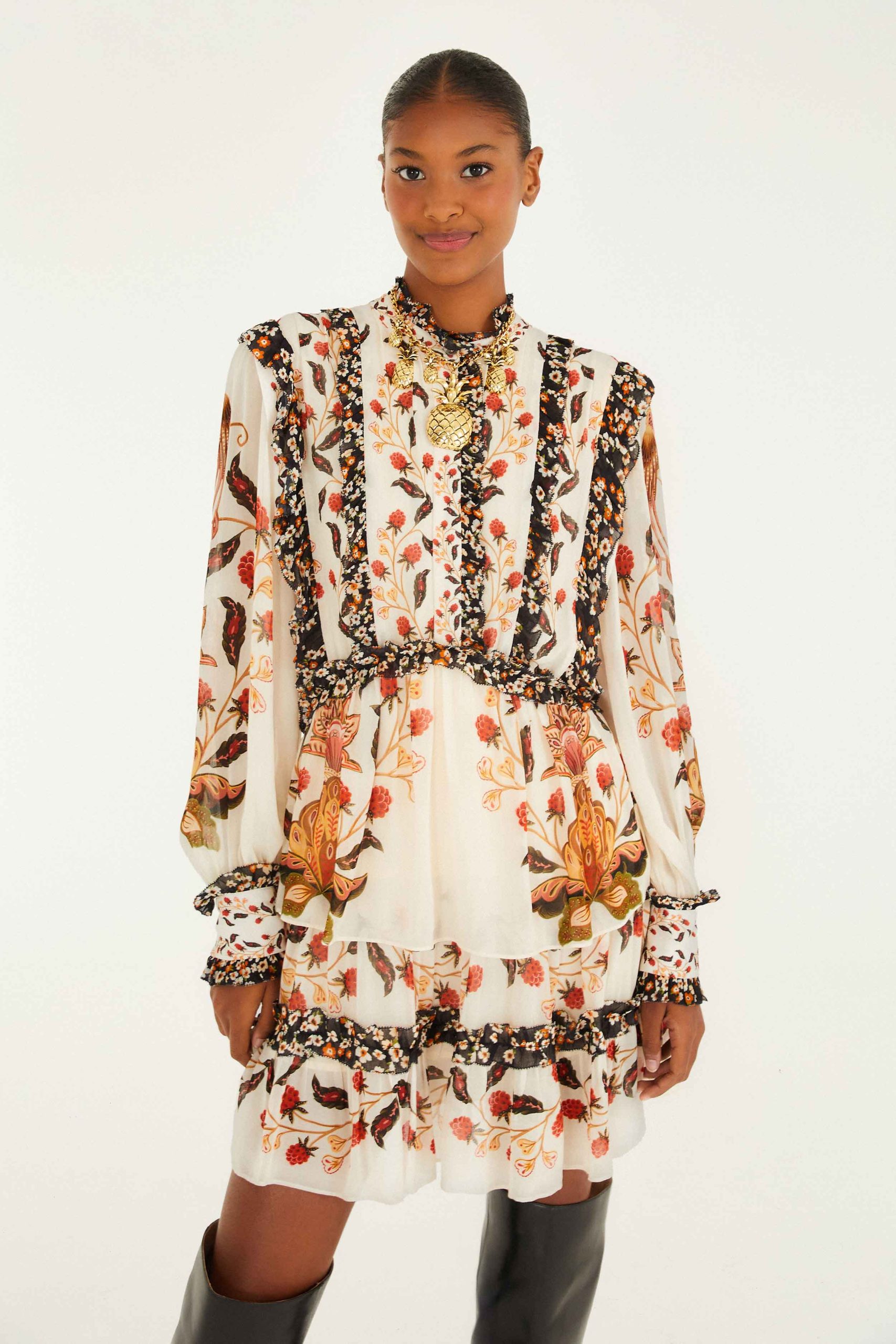 The Cream Berry Garden Mini Dress blooms with warm cream tones and vibrant berry florals, creating a playful garden allure. Delicate ruffled trims frame the high neckline, shoulders, and tiers, adding soft movement and charm. Its airy silhouette flows effortlessly, with intricate contrasting patterns that invite a touch of whimsy. Perfect for those who cherish a graceful, spirited style that feels like a breath of fresh, sunlit air.