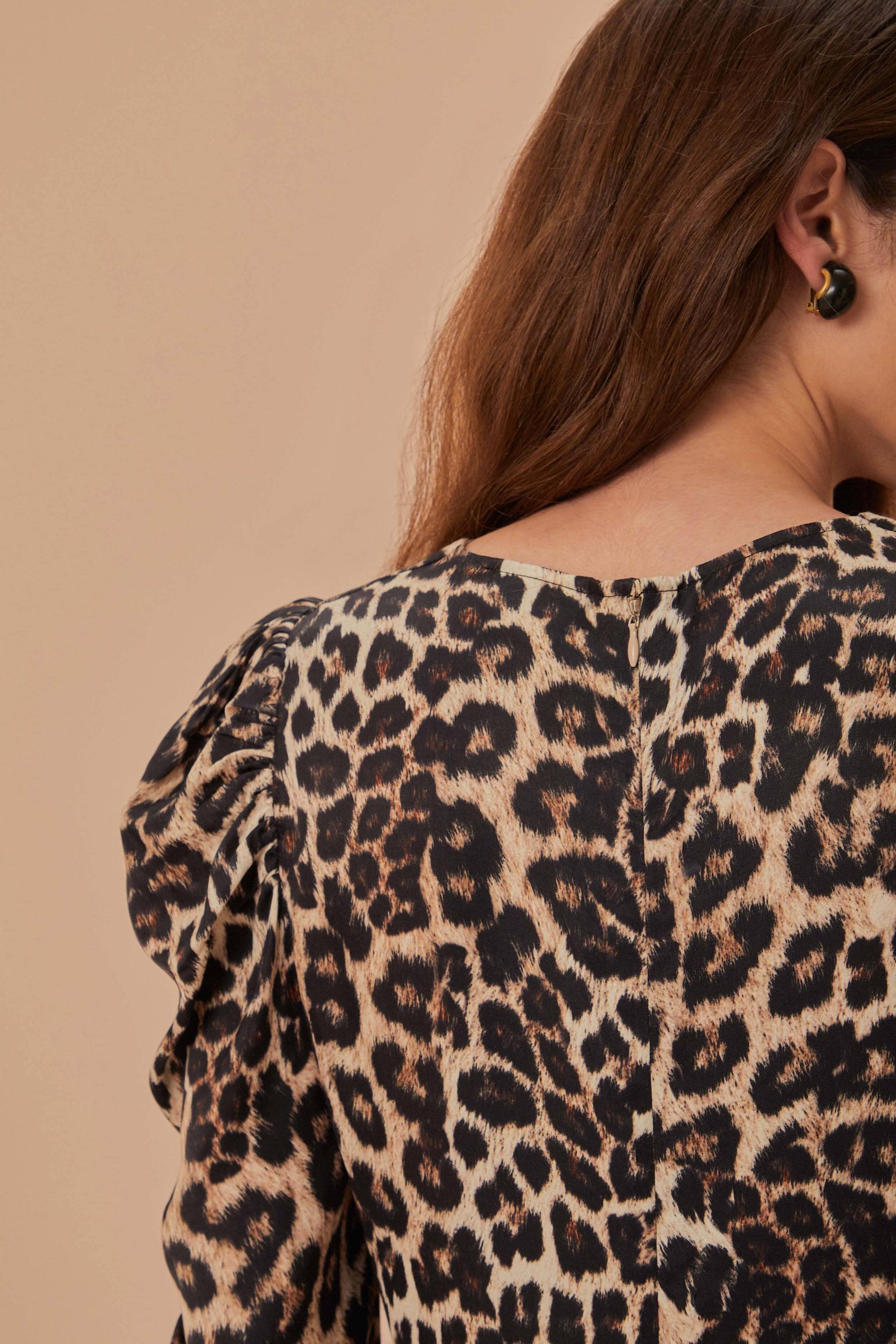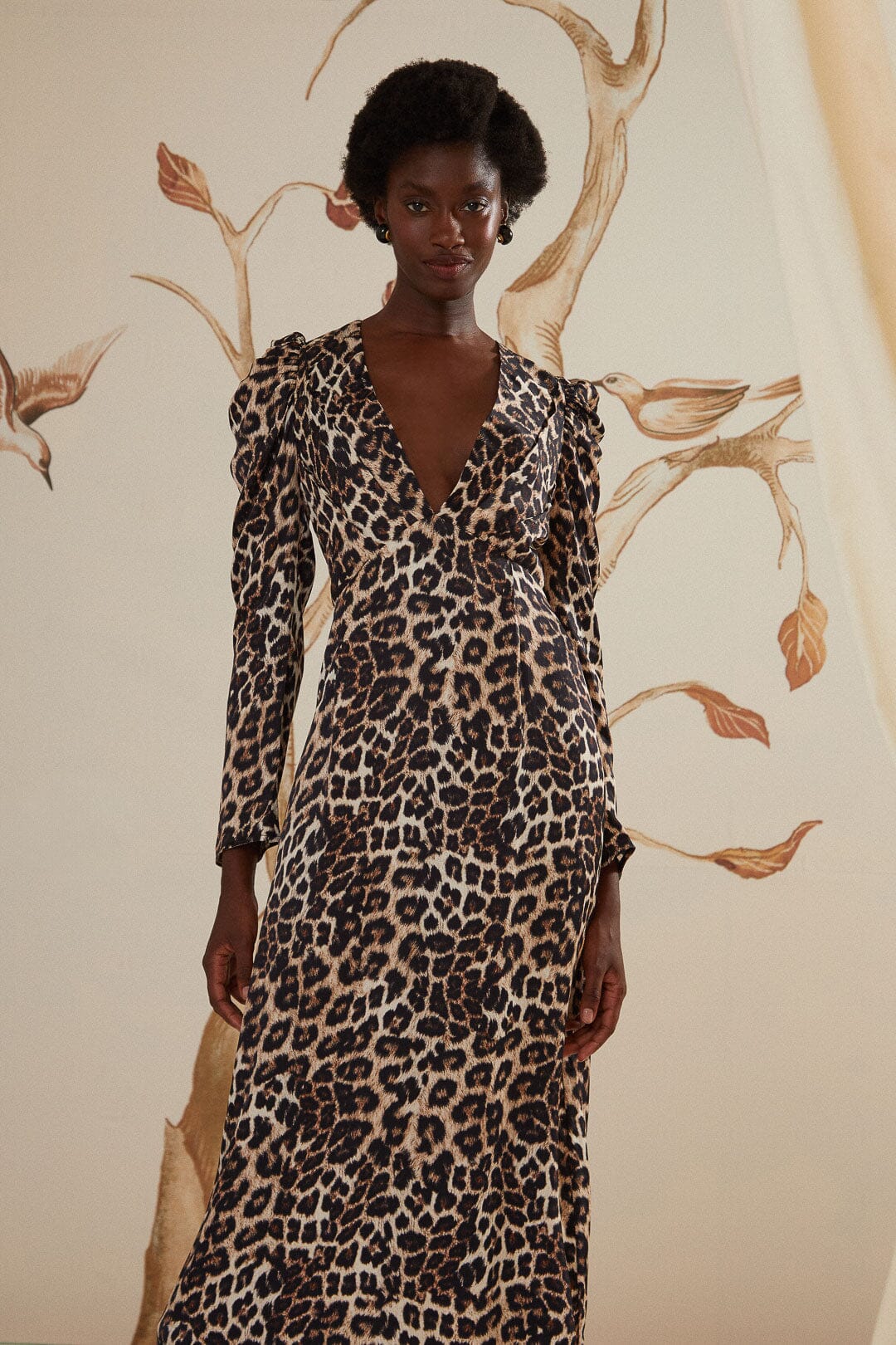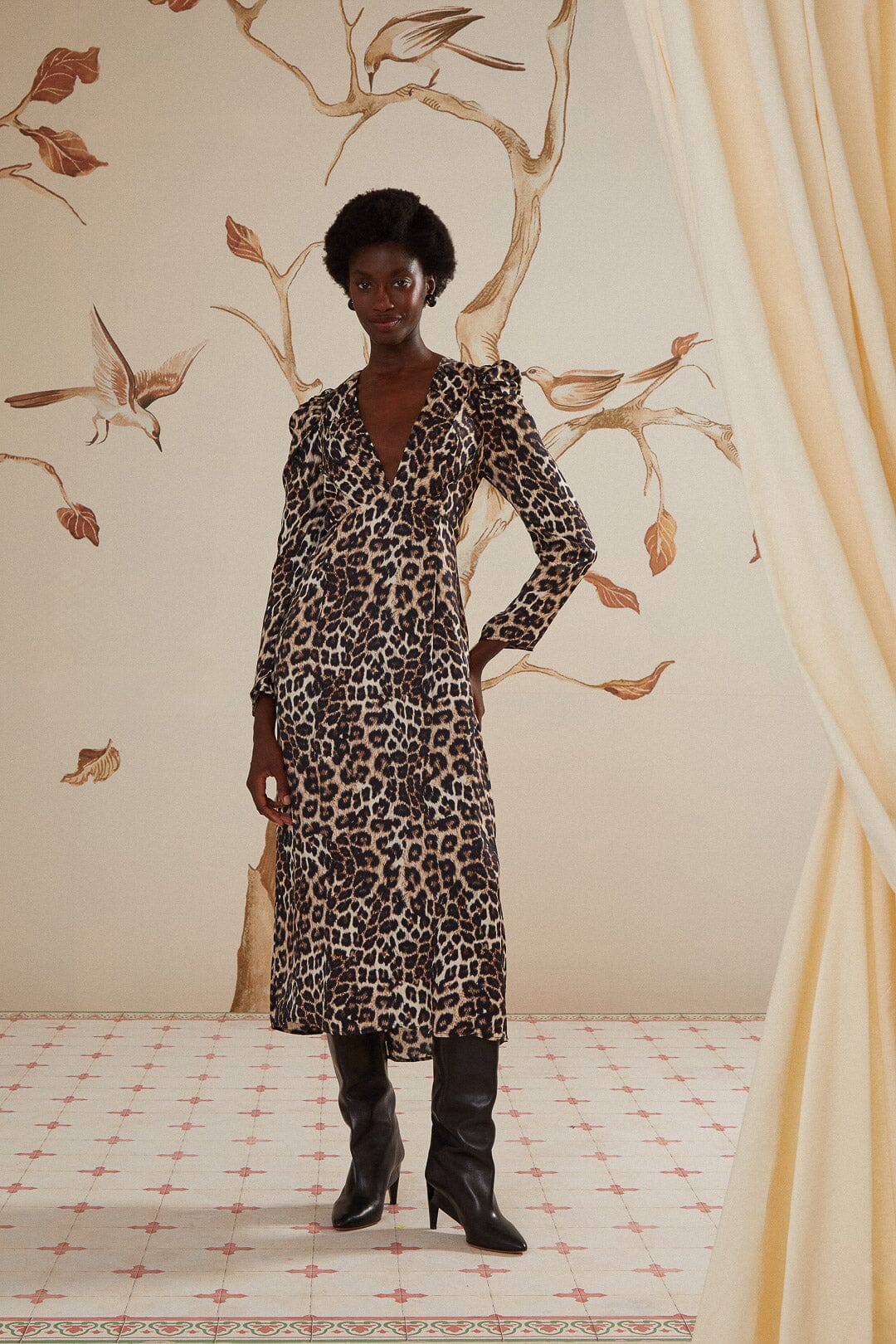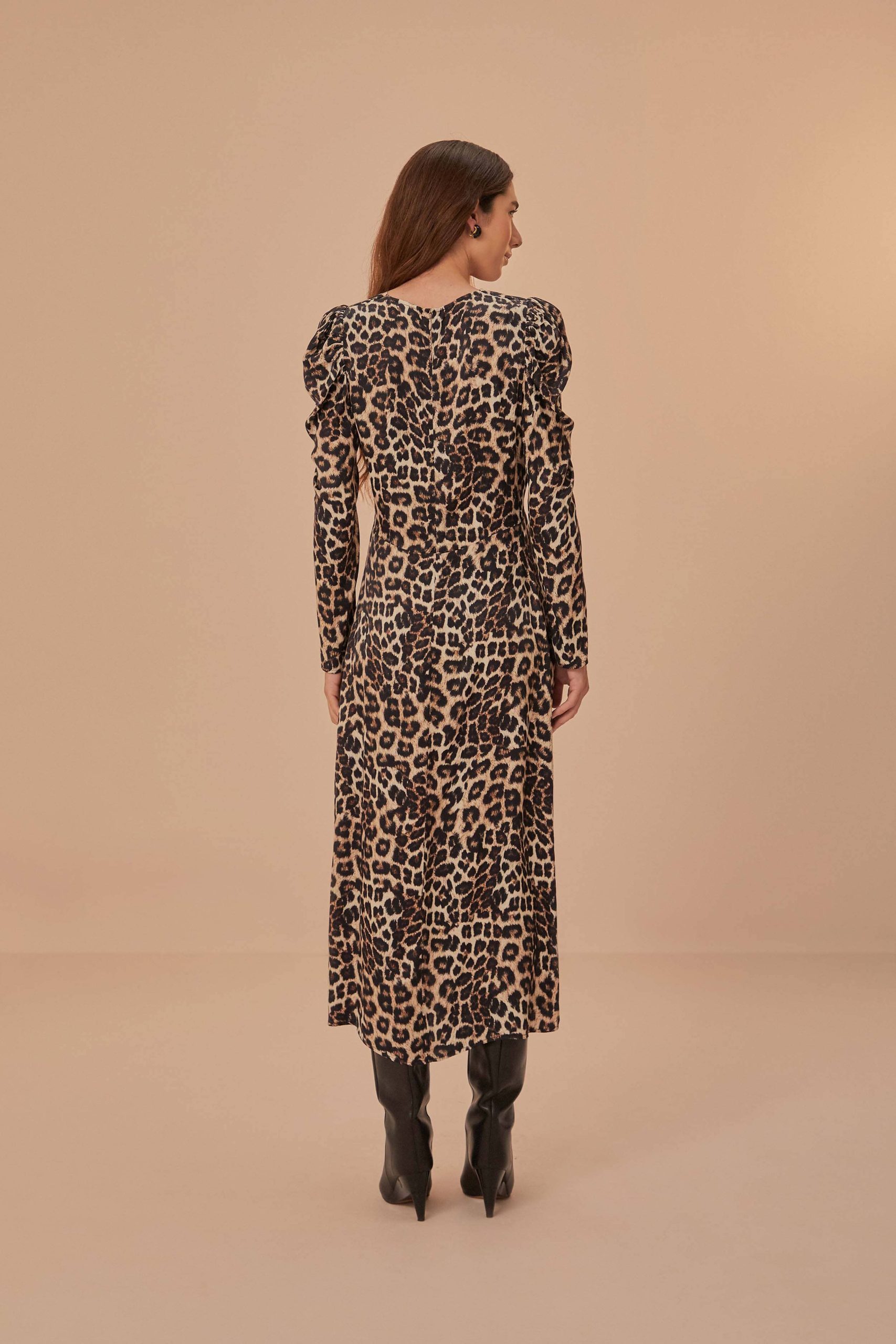 Indulge in the charm of the Cream Natural Skin LENZING™ ECOVERO™ Viscose Midi Dress, where a chic leopard print meets the elegance of a V neckline. Crafted from materials respectful to our planet, this piece features a flattering silhouette with puffed shoulders that add a dash of playfulness. The dress flows effortlessly, creating an enchanting movement as you walk, perfect for those who adore making a subtle yet captivating impression.LENZING™ ECOVERO™: the eco-responsible fibers generate up to 50% lower emissions and water impact compared to generic viscose.