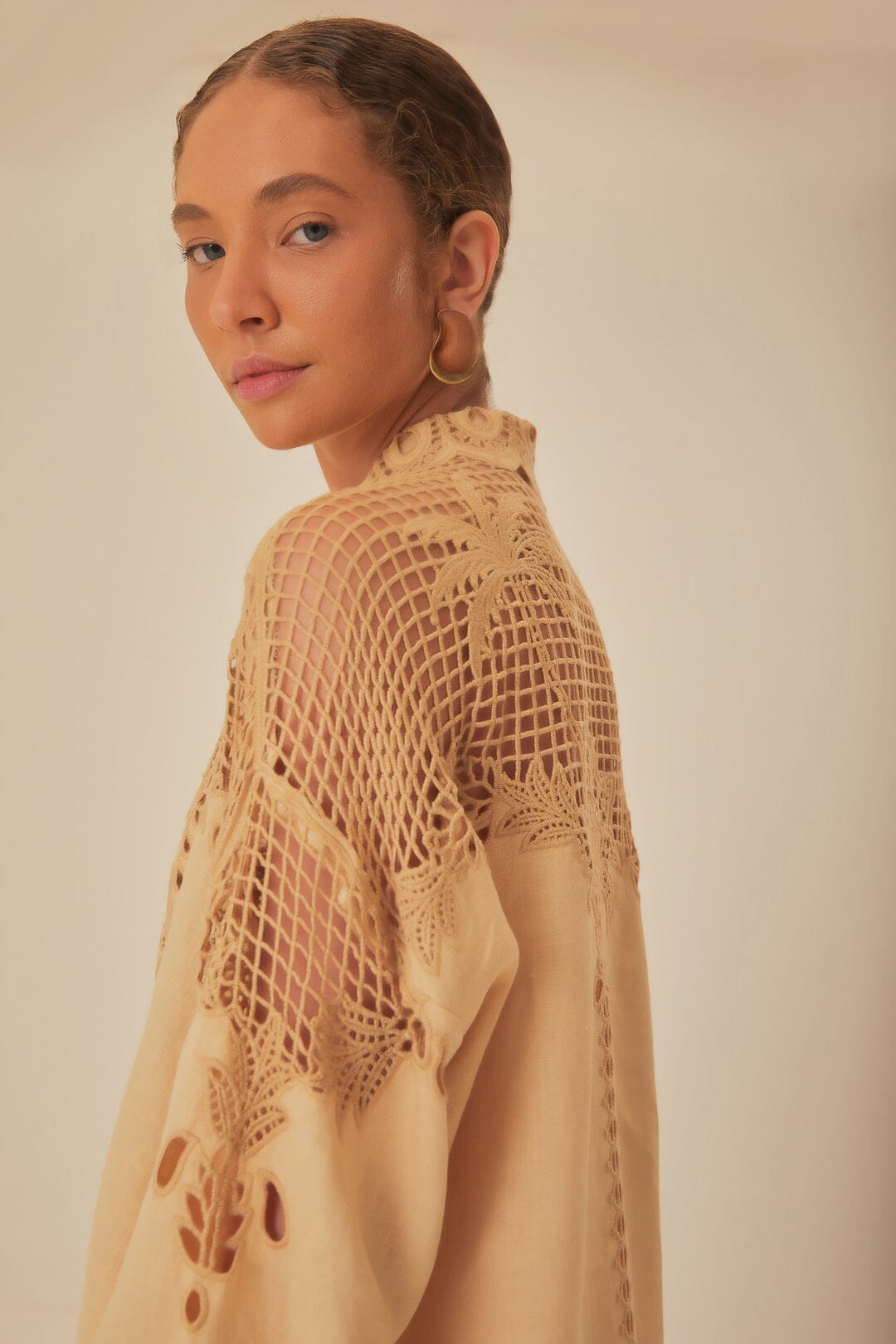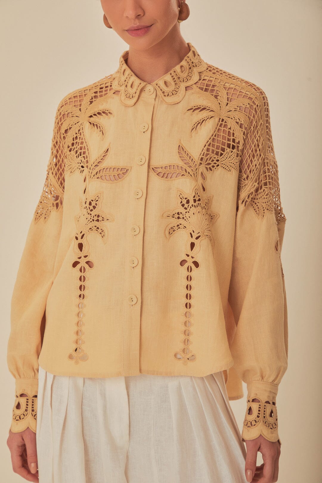 Infuse your wardrobe with the charm of the Khaki Palms Richelieu Euroflax™ Premium Linen Shirt, a true embodiment of elegance. This exquisite piece features intricate palm embroidery and openwork that breathes life into the rich khaki fabric. Designed with a classic collar neckline and tailored silhouette, the shirt is a luxurious blend of traditional craftsmanship and chic style, all while crafted from responsible materials that honor our planet. European Flax™: certified GMO-free plant fiber produced without artificial irrigation that has guaranteed traceability and proven comfort, thermoregulation, moisture management, and breathability.