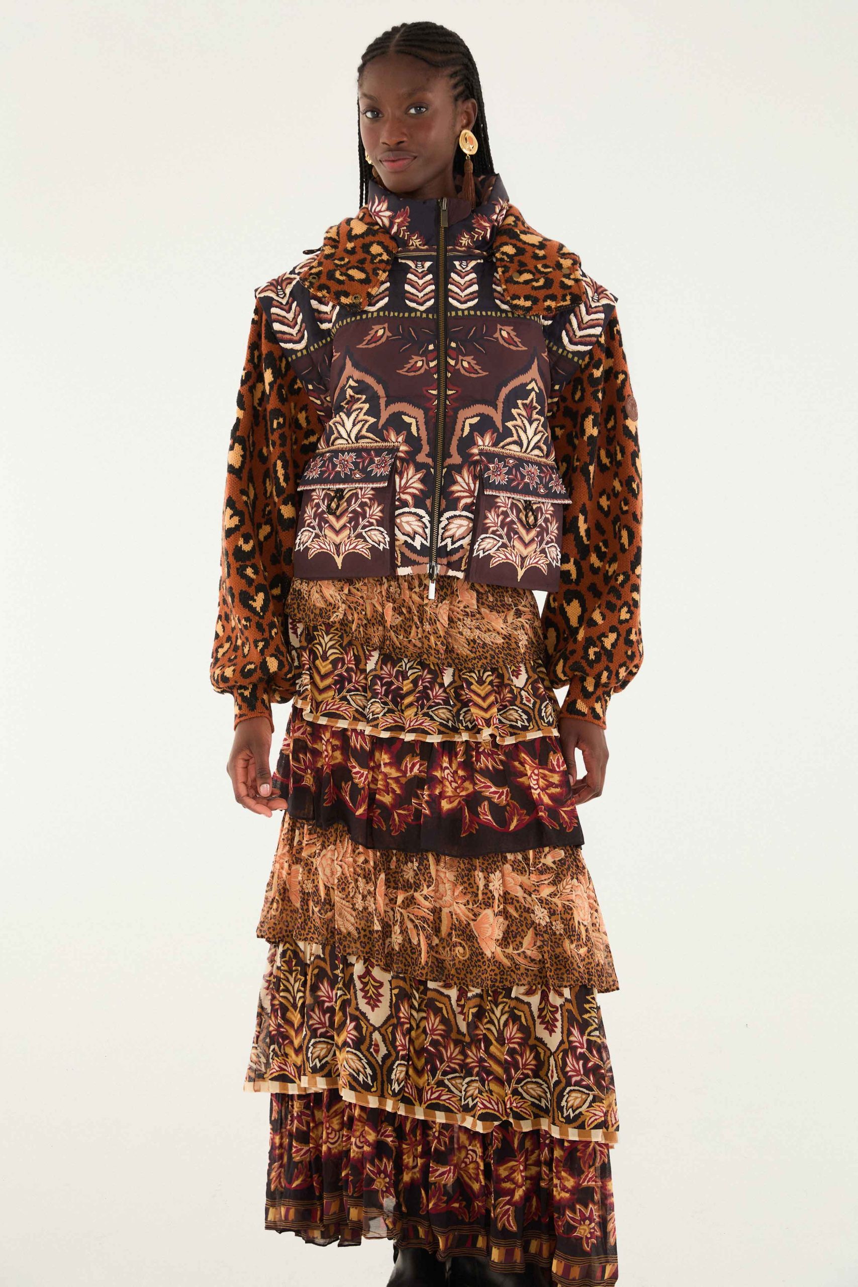 Embrace a joyful spirit with the Mixed Scarves Ruffled Maxi Skirt by FARM Rio. Its cascading layers blend rich jewel tones and earthy florals with hints of leopard print, creating a warm, playful harmony. The tiered ruffles add volume and a delicate sway, while the high waist adorned with intricate scarf patterns brings an unexpected charm. This skirt invites effortless movement and a cozy embrace, perfect for spirited days.