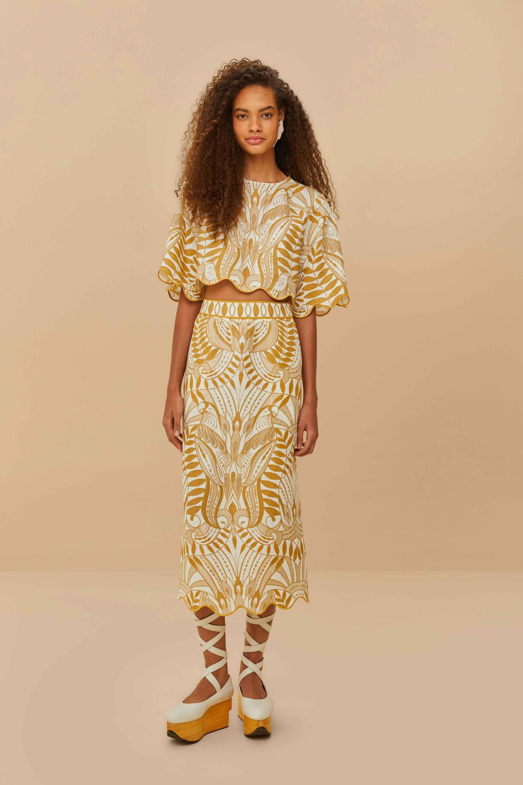Embrace elegance with the Off-White Lace Nature Euroflax™ Premium Linen Blouse. This enchanting piece features a round neckline and flowing, scalloped sleeves that add feminine charm. The intricate nature-inspired pattern in warm tones offers a captivating visual appeal. Crafted from responsible materials, this blouse creates a harmonious blend of style and consciousness. Perfect for those who cherish unique, artful designs with a touch of playfulness.LENZING™ ECOVERO™: the eco-responsible fibers generate up to 50% lower emissions and water impact compared to generic viscose.