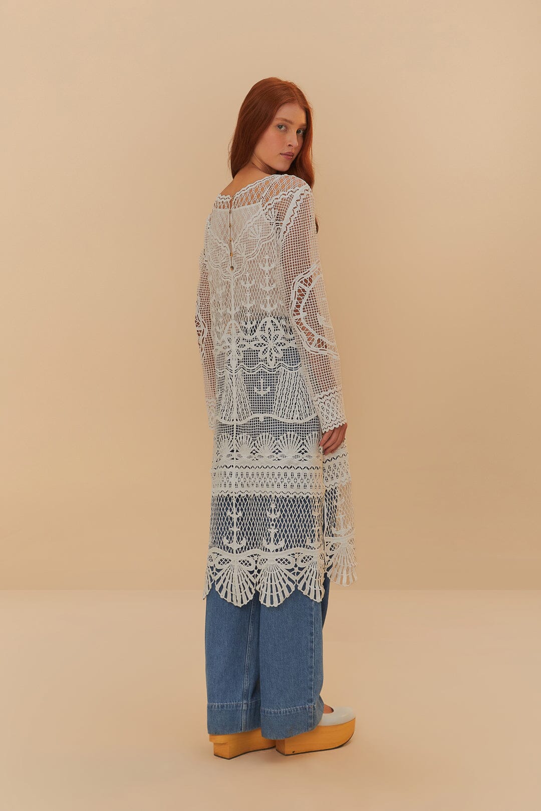 Embrace elegance with the off-white nautical guipure long sleeve midi dress. Featuring intricate guipure lace with delicate nautical motifs, this piece radiates charm. The round neckline beautifully frames the face, while the breezy silhouette flows gracefully. Perfect for adding a touch of sophistication to your day. The exquisite craftsmanship makes it a timeless addition to any wardrobe, effortlessly blending tradition with modern flair.