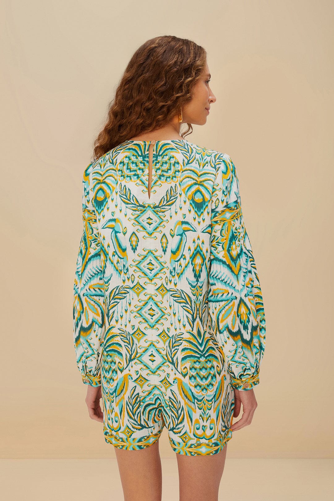 Wrap yourself in the vibrant allure of the off-white tropical tapestry euroflax™ premium linen romper. Its V neckline and playful long sleeves embrace you with artistic greenery and geometric motifs. Crafted from responsible materials, this romper offers both comfort and style. The exquisite print captures the spirited essence of tropical landscapes, making every wear a celebration of color and creativity. A perfect blend of elegance and flair.