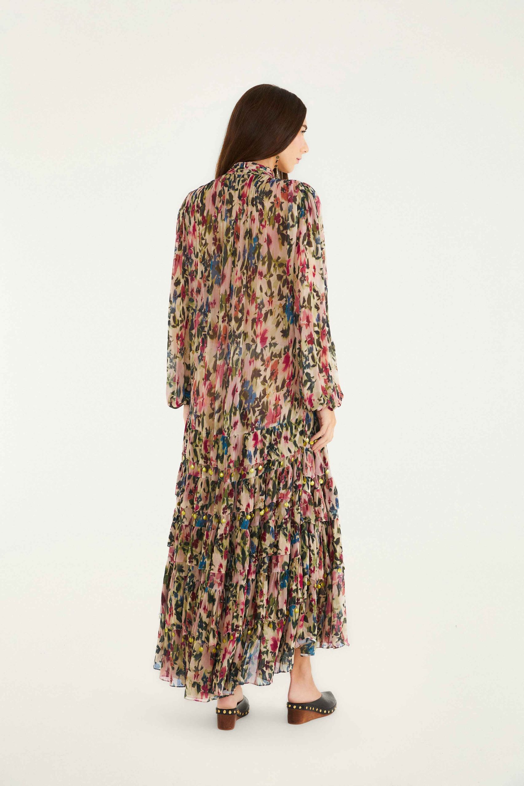 The Pink Blurred Tiny Flowers Long Sleeve Maxi Dress is a poetic dance of soft pinks, deep blues, and gentle greens in blurred floral patterns. Its high neckline adds a graceful touch, while layered ruffles cascade playfully along the maxi silhouette. Delicate bead accents twinkle subtly, celebrating the feminine spirit. With long, billowy sleeves and a cinched waist, this dress embraces warmth and effortless charm for those who cherish timeless elegance.