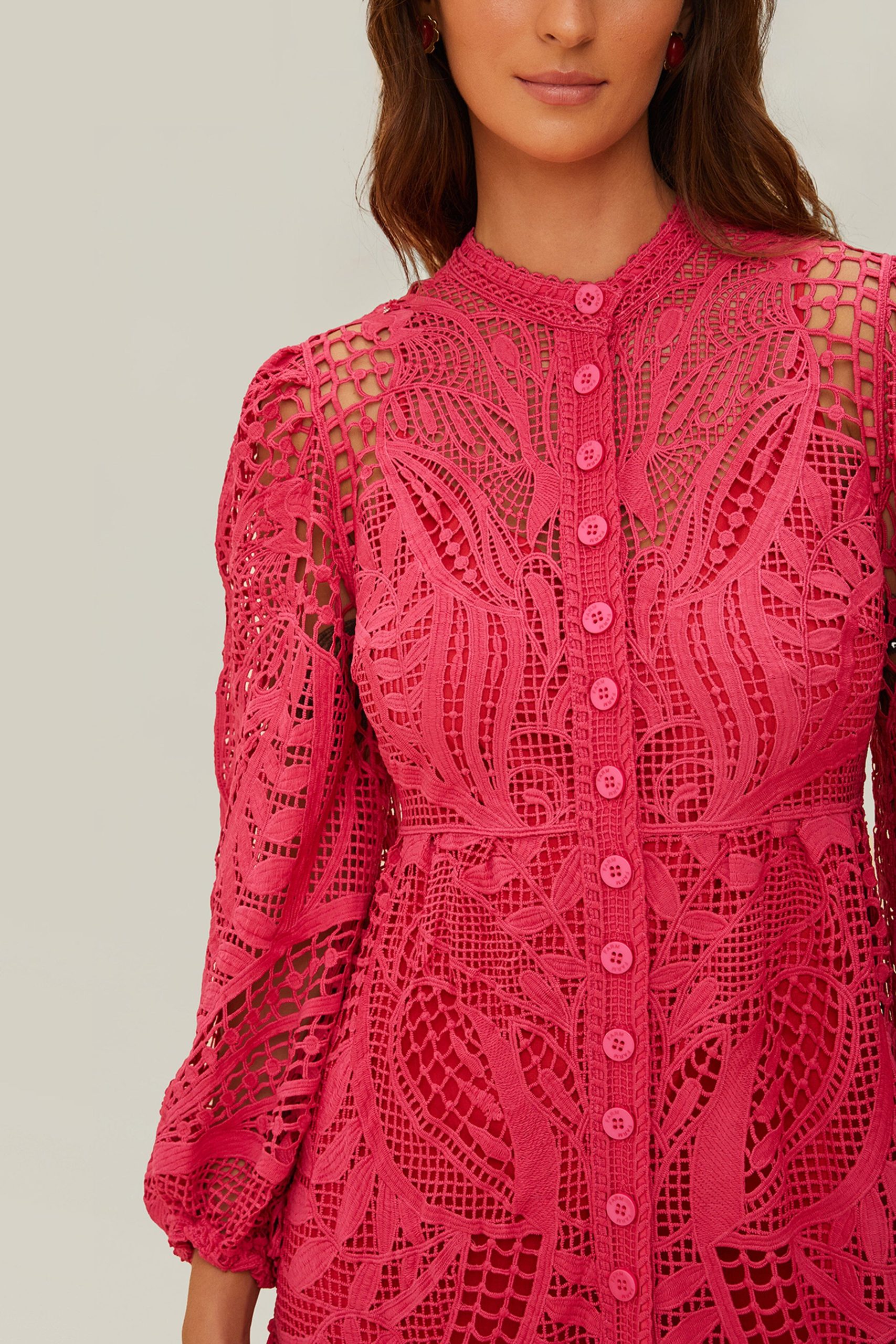 Embrace the beauty of femininity with the Pink Guipire Maxi Dress from FARM Rio. This stunning piece features a sophisticated high neckline and enchanting guipire lace detailing that exudes elegance and charm. The vibrant pink hue is sure to turn heads, while the flowing silhouette promises a graceful movement. Perfect for any occasion, this dress is a true representation of Brazilian flair and fashion.