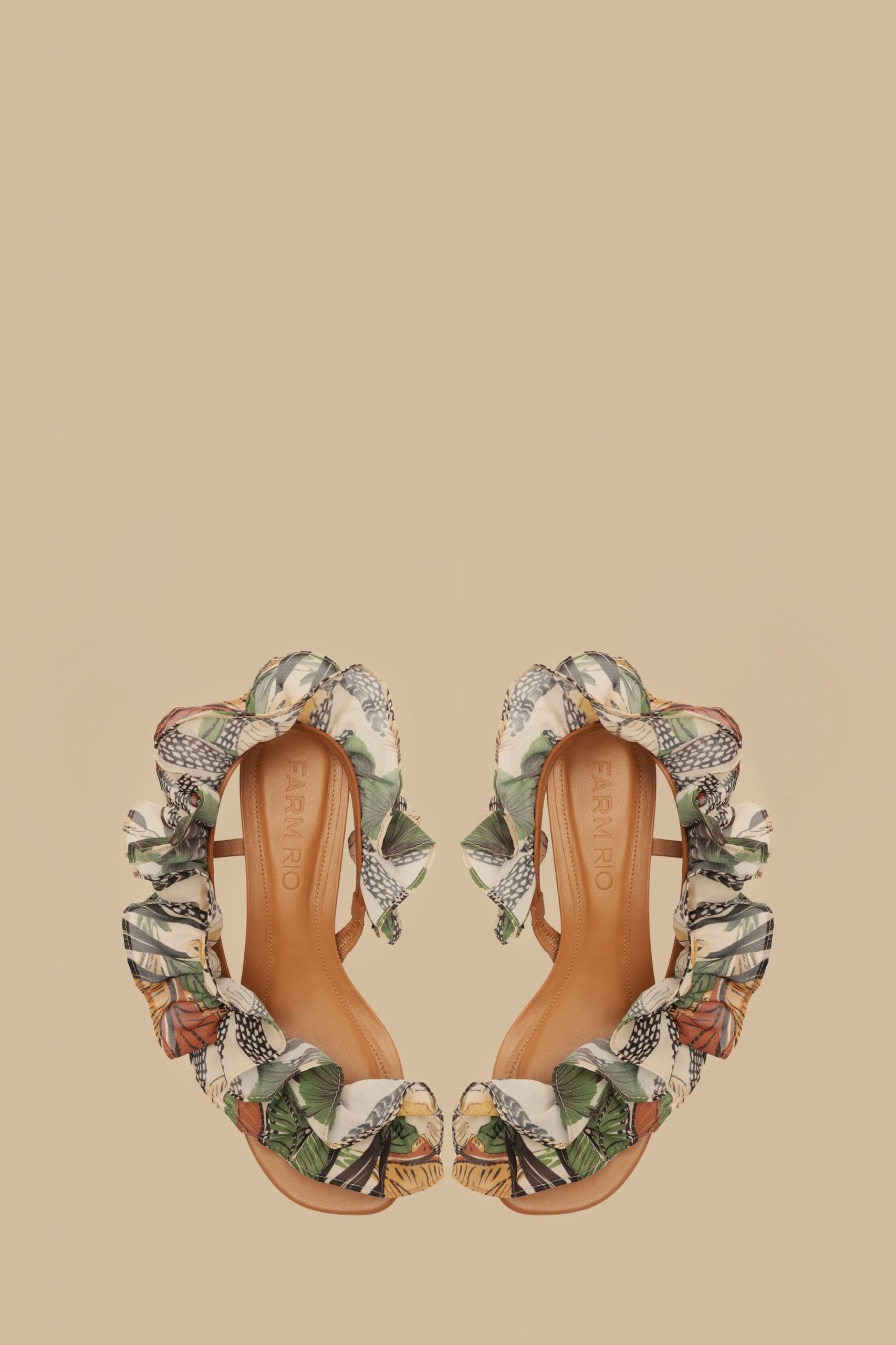 Step into a world of tropical charm with the Sand Foliage Sketch Monstera Heeled Sandal by FARM Rio. Adorned with intricate embroidery, these sandals showcase lush monstera leaf patterns against a rich tapestry of greens and earthy tones. The sculpted heel adds a touch of flair, while the flowing silhouette captures a whimsical spirit. Crafted from responsible materials, these sandals effortlessly blend playful elegance with eco-conscious artistry.