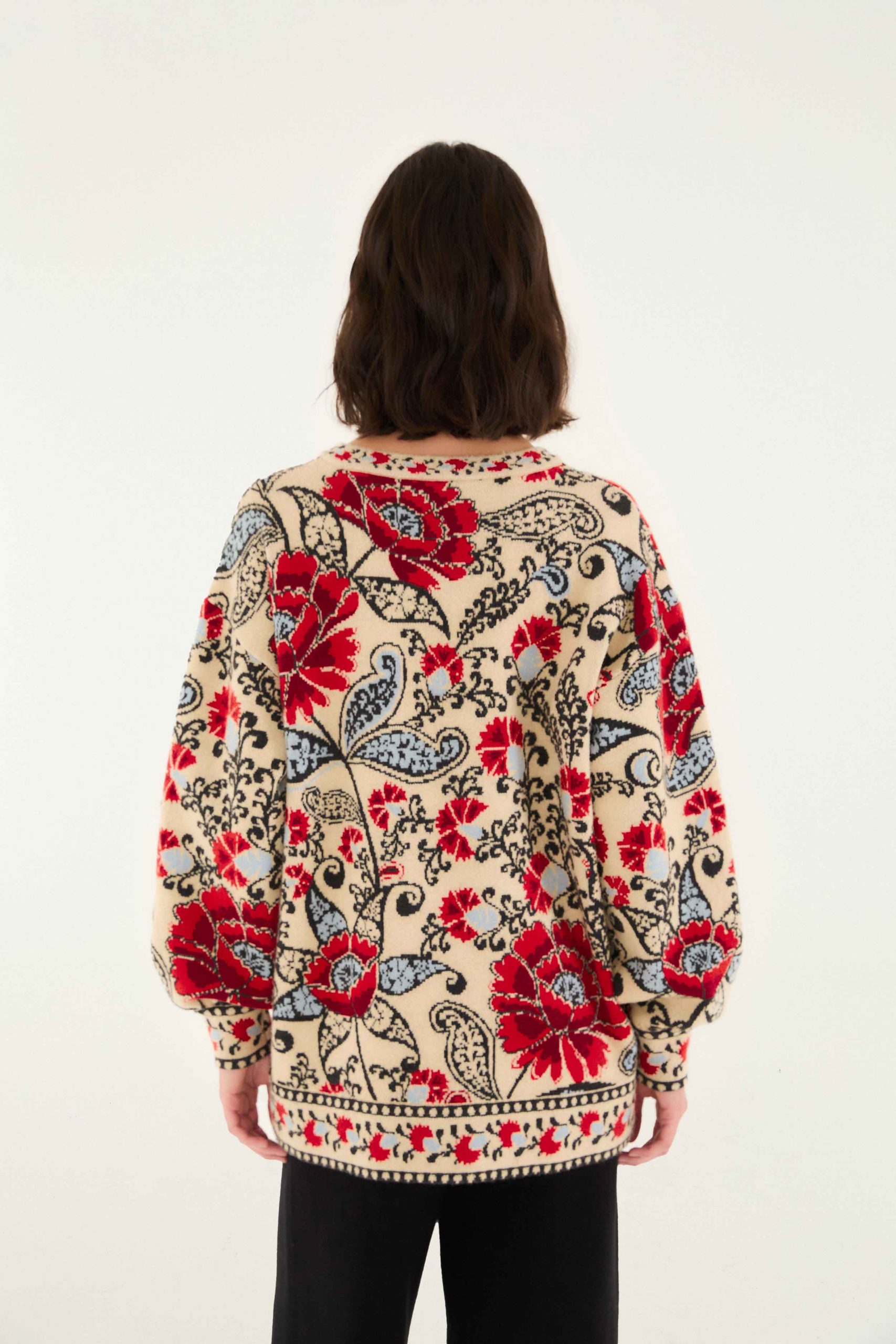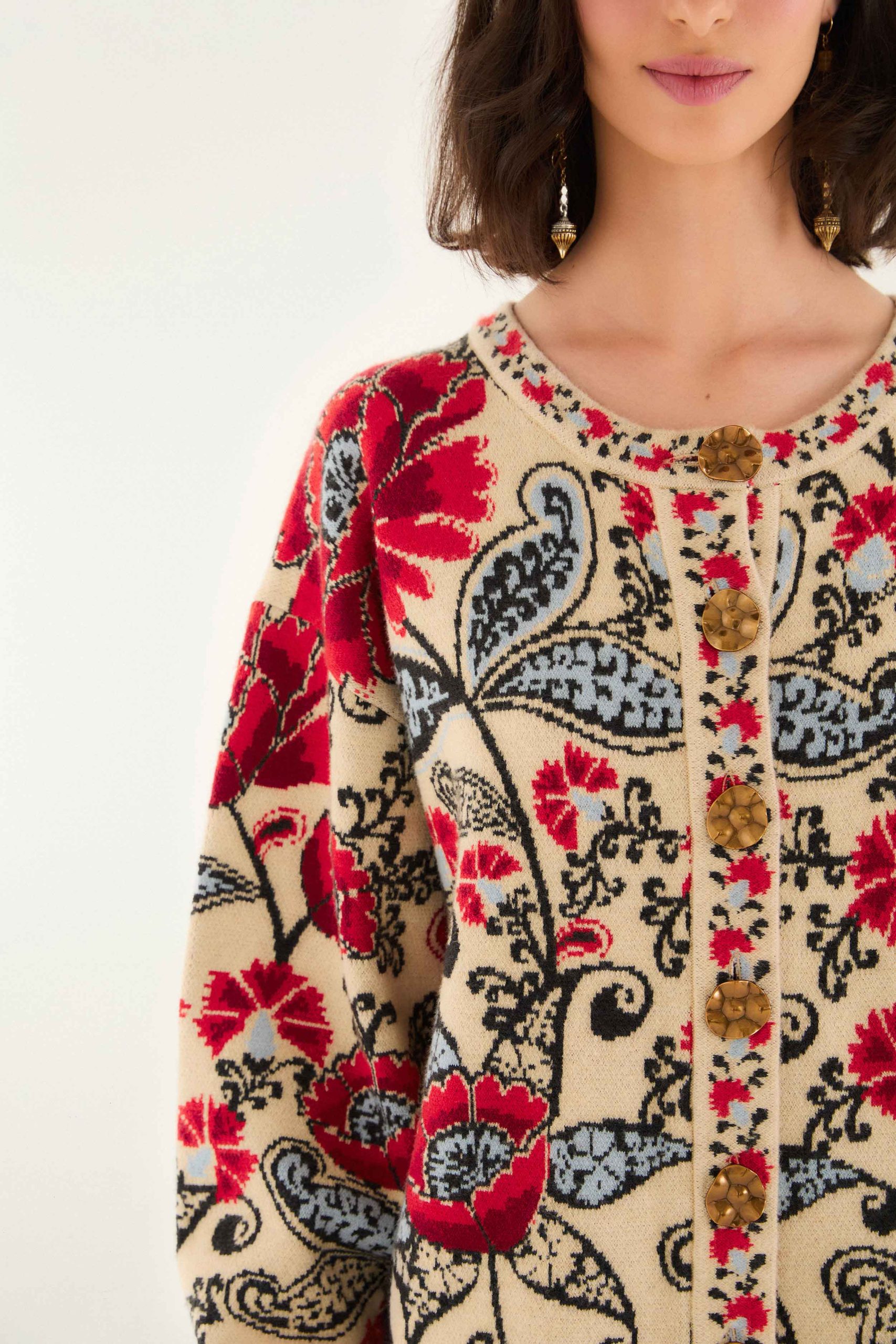 The Sand Francesca Knit Cardigan wraps you in a cozy embrace with its creamy base enlivened by vivid red, soft blue, and black floral patterns. Its relaxed silhouette features gently voluminous sleeves and a classic round neckline, inviting effortless layering. The standout sculpted buttons and finely detailed botanical motifs blend warmth and playfulness, making this knitwear a timeless piece that enchants with every wear.