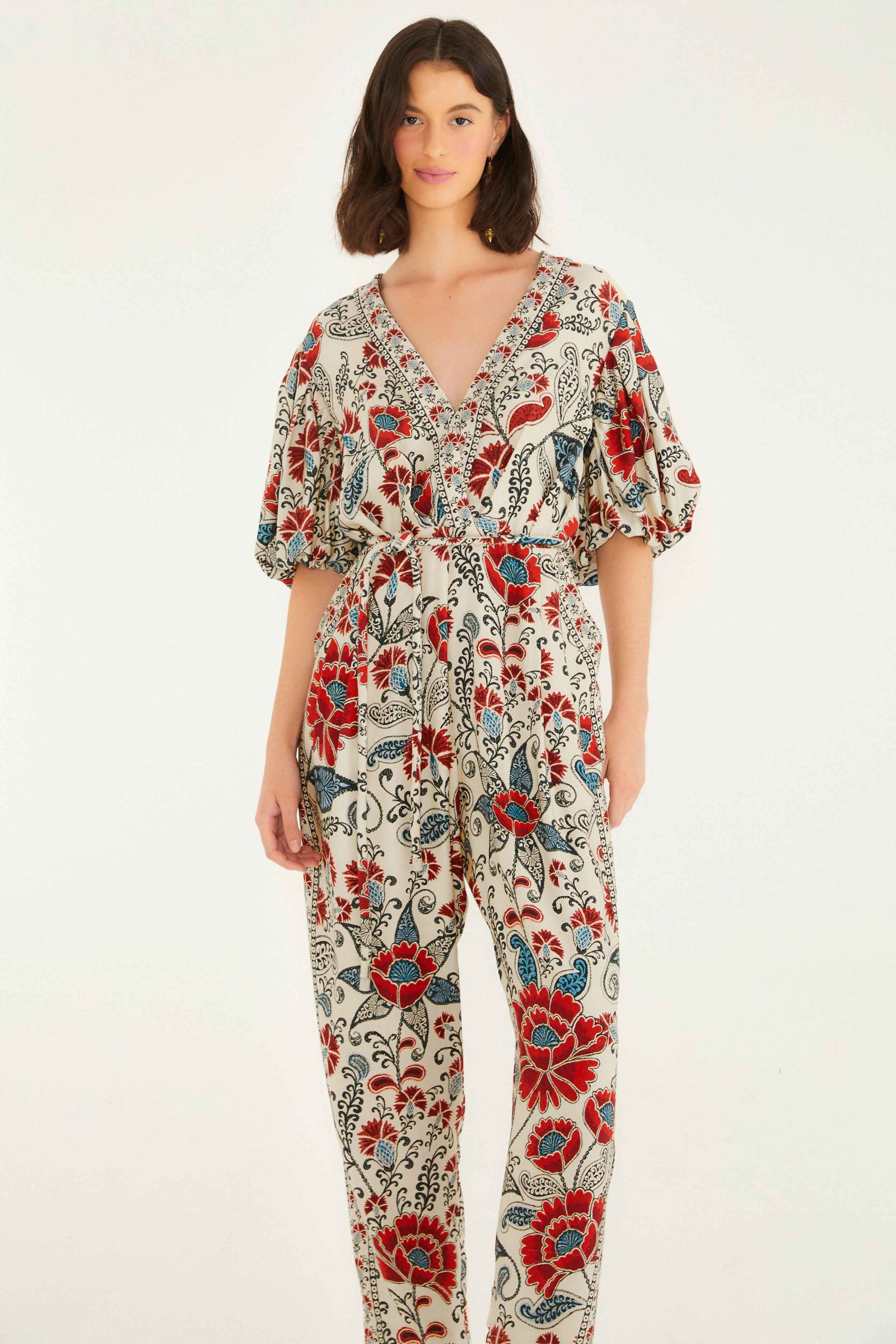 The Sand Francesca V Neckline Short Sleeve Jumpsuit from FARM Rio invites a playful embrace of nature with its rich floral pattern in warm reds and cool blues on a gentle sand background. Its relaxed silhouette is enlivened by voluminous puff sleeves and a softly cinched waist, enhancing effortless comfort. The deep V neckline adds a touch of ease and femininity, crafting a look that’s both inviting and distinctly joyful.
