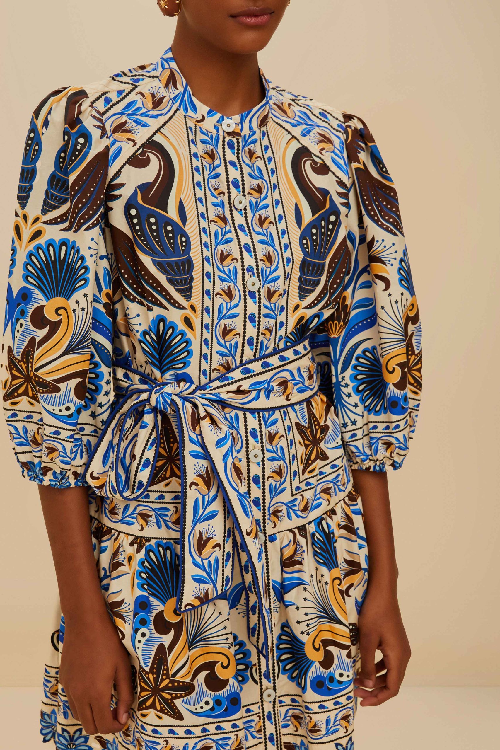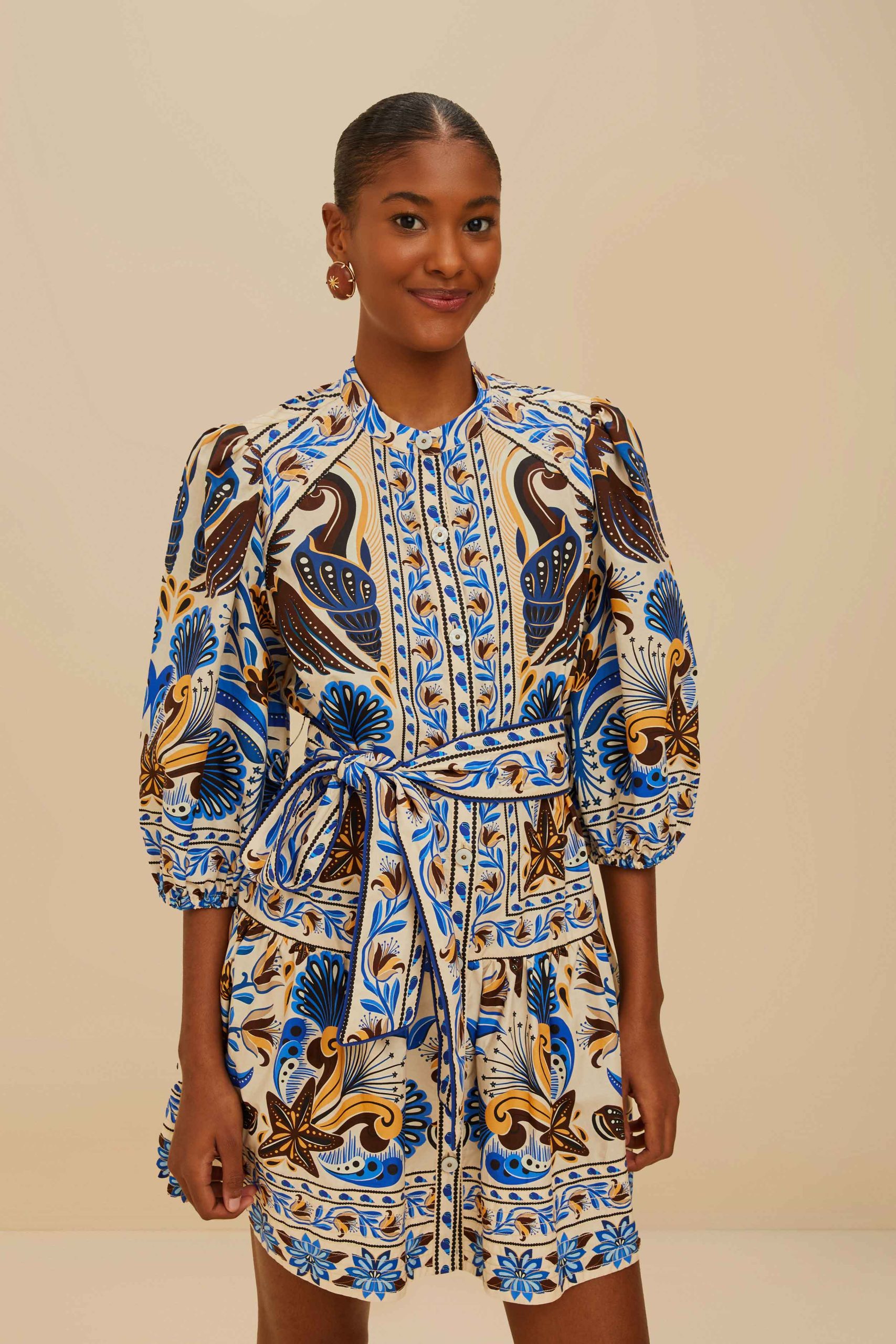 Embrace the playful elegance of the Sand Nature Land Organic Cotton Mini Dress by FARM Rio. This dress delights with its intricate blue and earth-toned patterns, weaving a tapestry of nature-inspired motifs. The flattering halter neckline pairs effortlessly with voluminous puff sleeves, adding a touch of drama. Crafted from responsible materials, it’s an embodiment of style and care. Perfectly playful and chic, this piece invites joyful expression.
