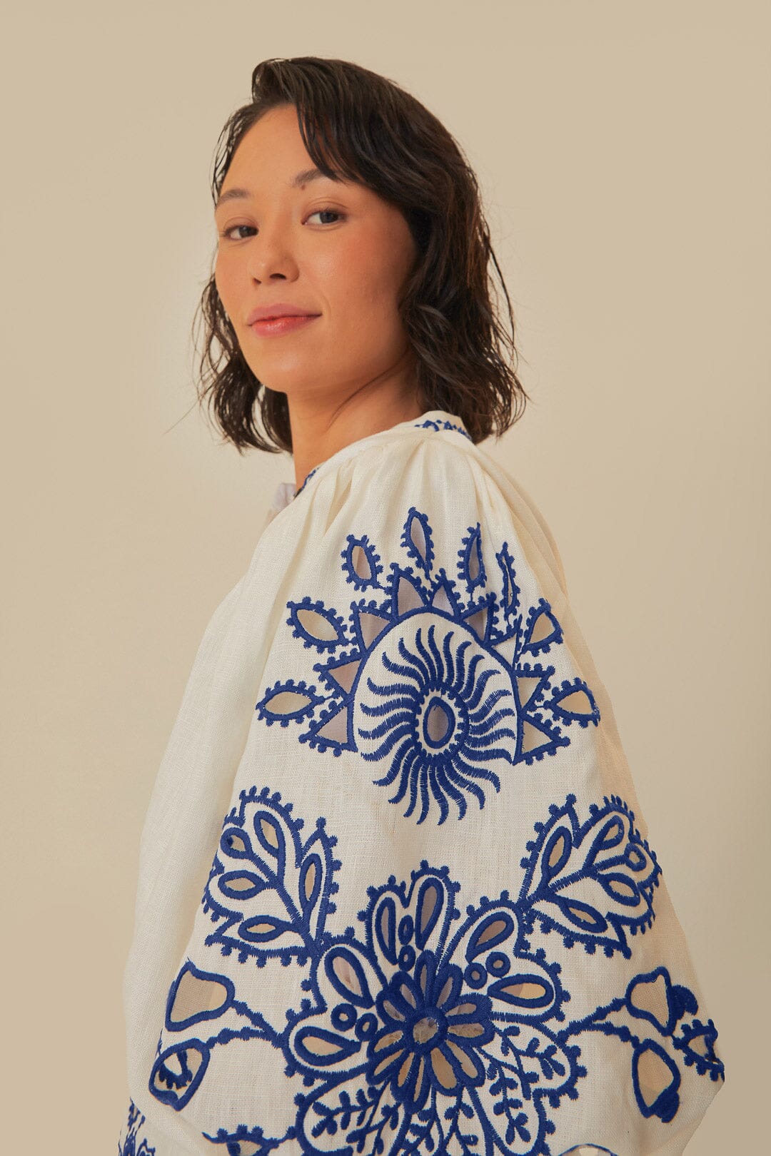 Discover the White Richelieu Euroflax™ Premium Linen Mini Dress, a treasure with its intricate blue embroidery accentuating its high neckline and flutter sleeves. Crafted from premium linen made of responsible materials, this dress features a lovingly scalloped hem and a cinched waist, delivering a playful yet poised charm. Embracing a breezy silhouette, this piece is a poetic expression of elegance for any warm-hearted adventure. European Flax™: certified GMO-free plant fiber produced without artificial irrigation that has guaranteed traceability and proven comfort, thermoregulation, moisture management, and breathability.