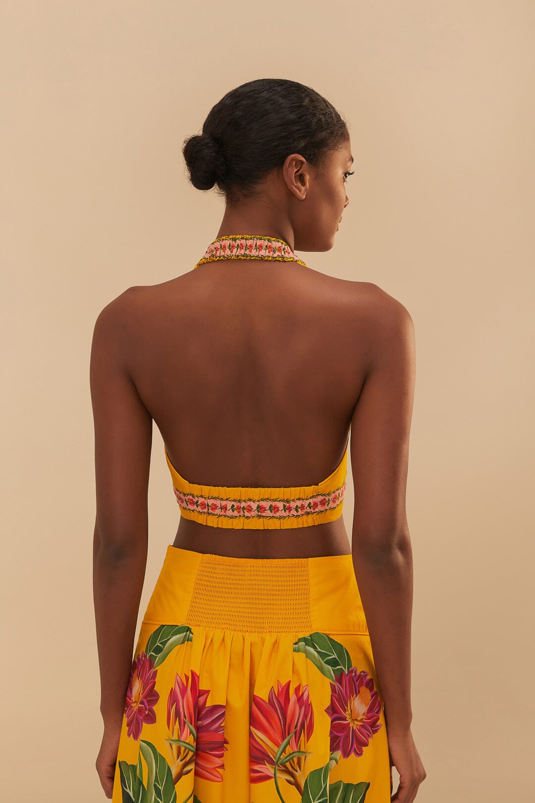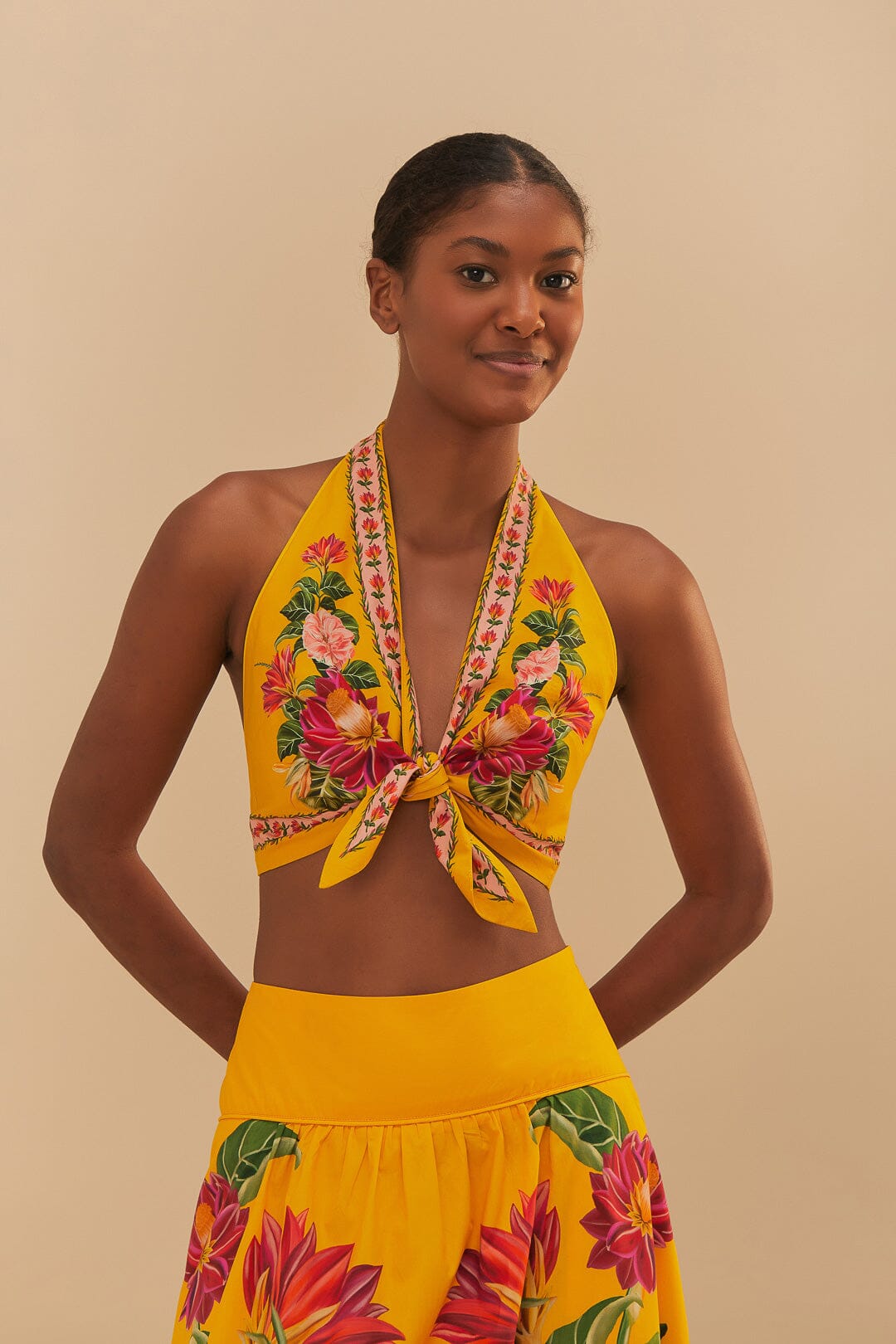 Step into a garden of color with the Yellow Spring Awakening Organic Cotton Crop Top. Featuring a halter neckline adorned with vivid floral patterns, this top radiates charm and joy. Its vibrant yellow backdrop captures the warmth of sunlight, while responsibly sourced materials offer a feel-good wear. The playful tie-front design infuses a carefree spirit, making it a delightful addition to any wardrobe.GOTS-certified organic cotton has a lower environmental impact than conventional cotton, as it reduces water usage, greenhouse gas emissions, and the amount of chemicals used.